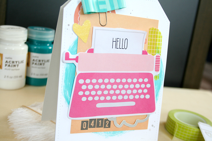 I started by die cutting a card using Mama Elephants Tags a Lot die, then swirled some paint in a big circle. Next I layered lots of die cuts (mostly from Amy Tan's new Rise & Shine collection). Next I layered in some washi tape and added the typewriter stamped with a sentiment from My Favorite Things You Gnome Me.